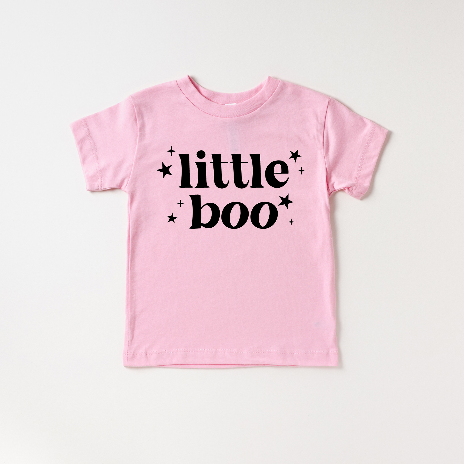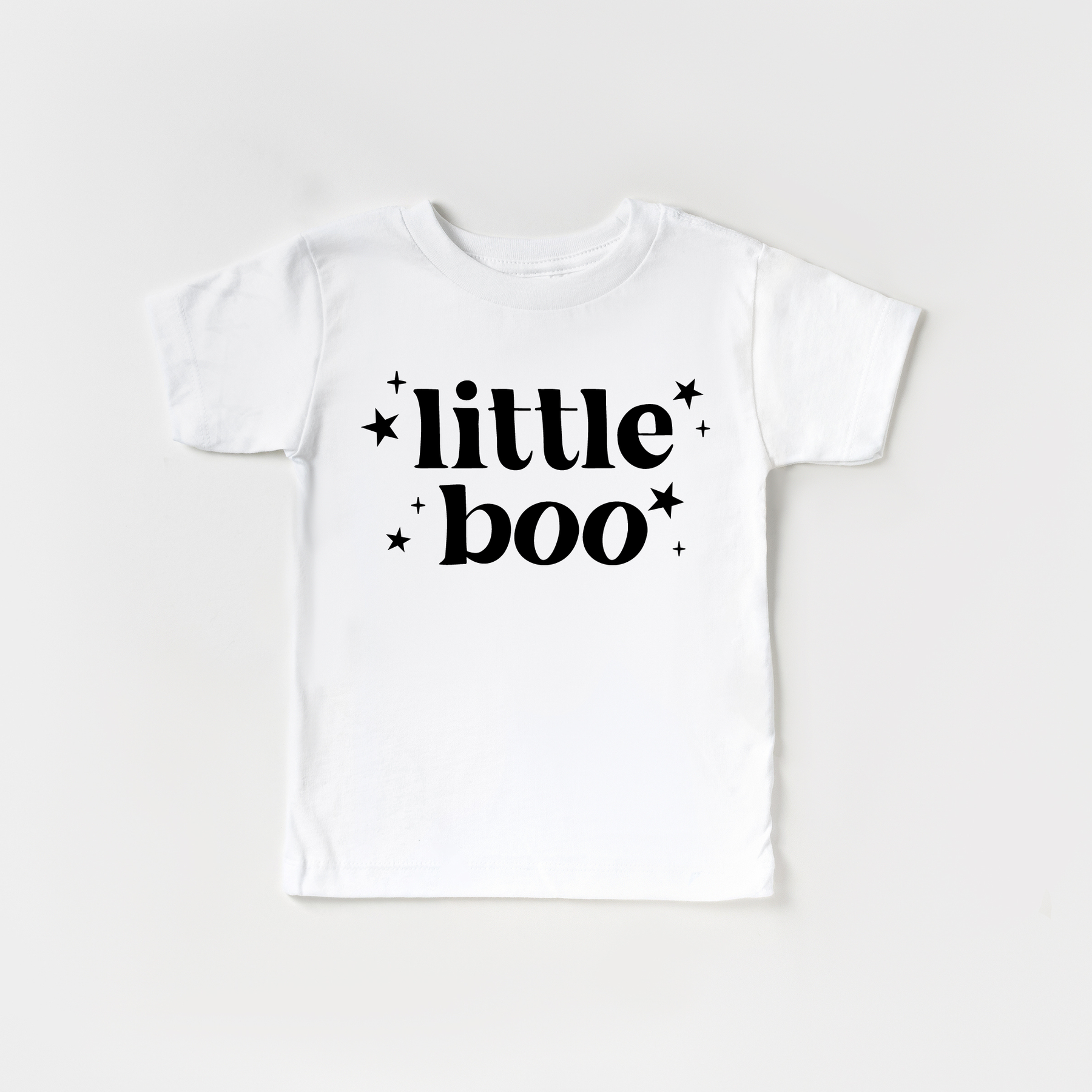 Little Boo! Details Features & Sizing *Crewneck, pullover styling *Short sleeves * Black or white Print Materials & Care *Soft Feel *100% Cotton *Machine wash cold, dry flat *Iron inside out