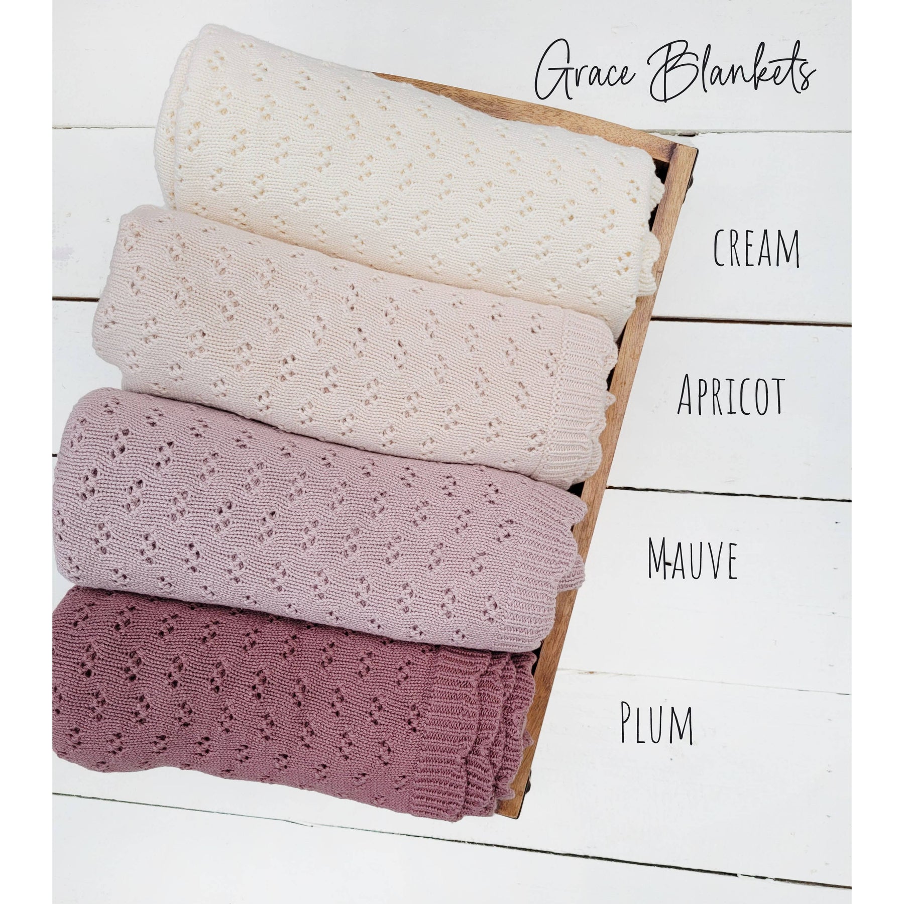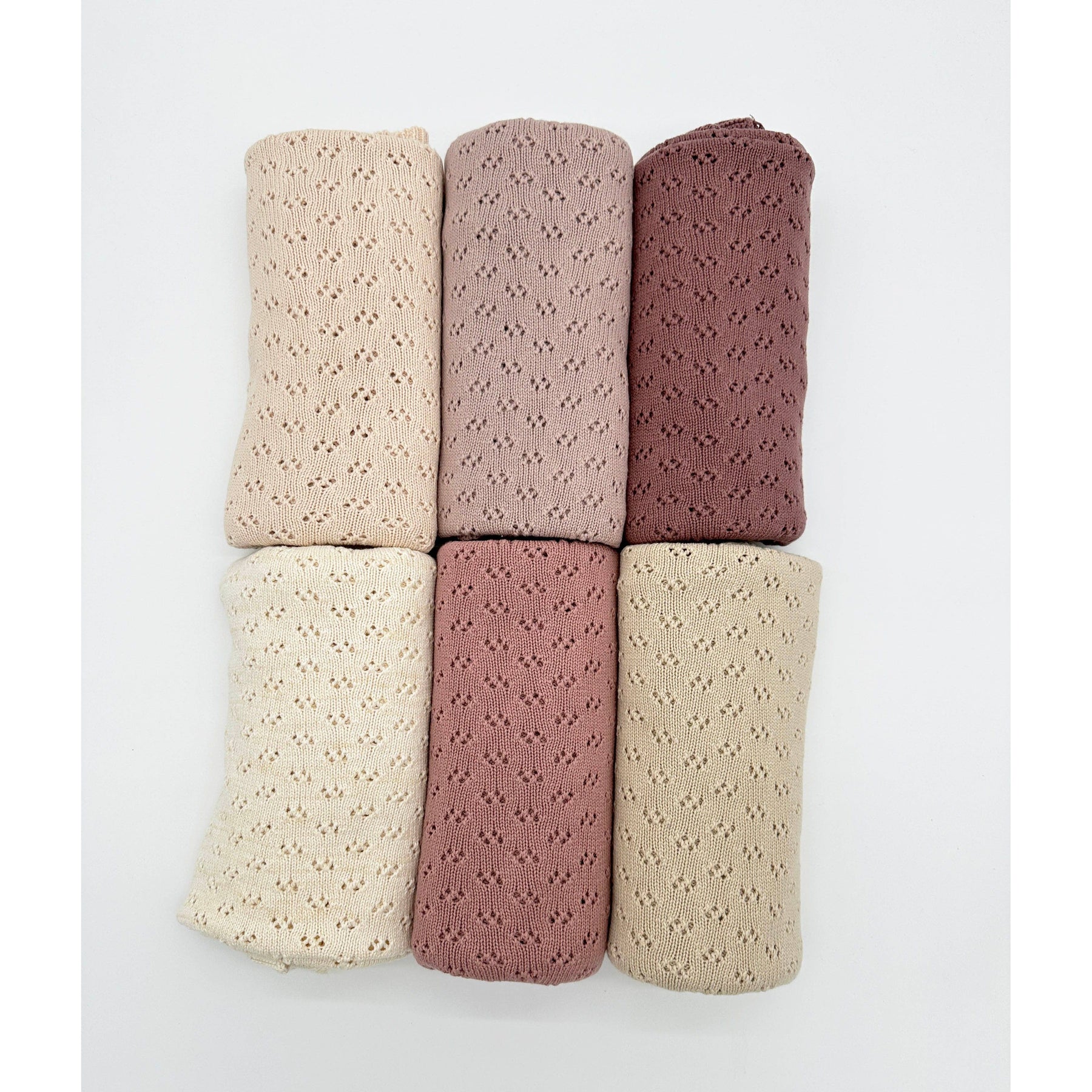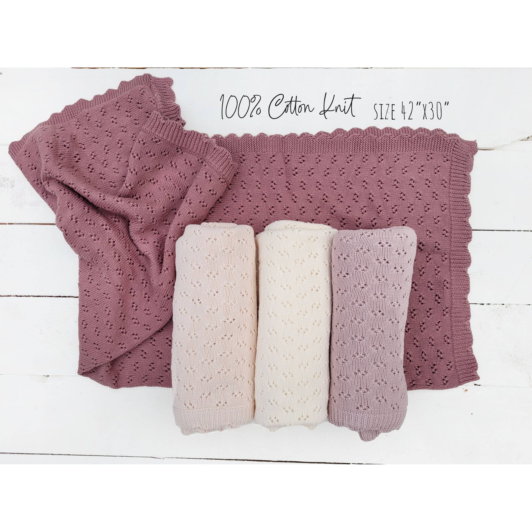 100% cotton Baby blanket Swaddle Cover Grace Knit style Measuring 42in by 30in Machine washable on Gentle with like colors. Dry on low heat.