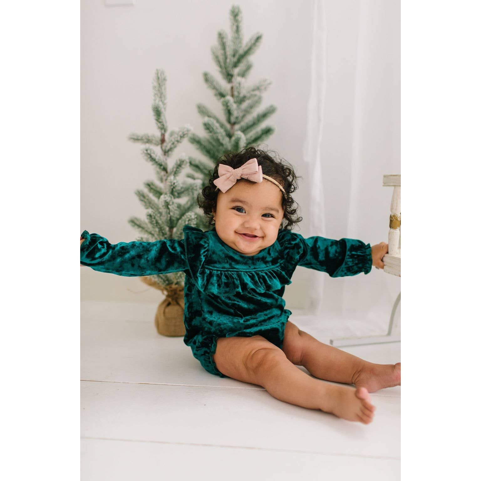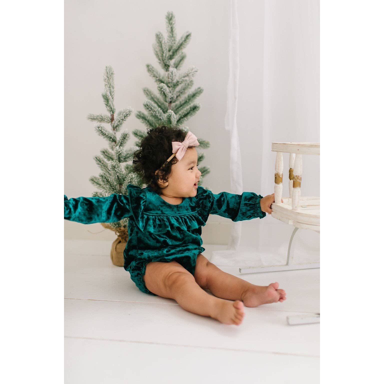 The Hayley Bubble is an elegant one-piece with thoughtful, vintage-inspired details. Made from soft and cozy velvet, it features flowy long sleeves with ruffled wrists, a square-shaped ruffle across the bodice, and a double button back with loop closure for easy dressing. A three-snap diaper closure ensures quick and simple changes.