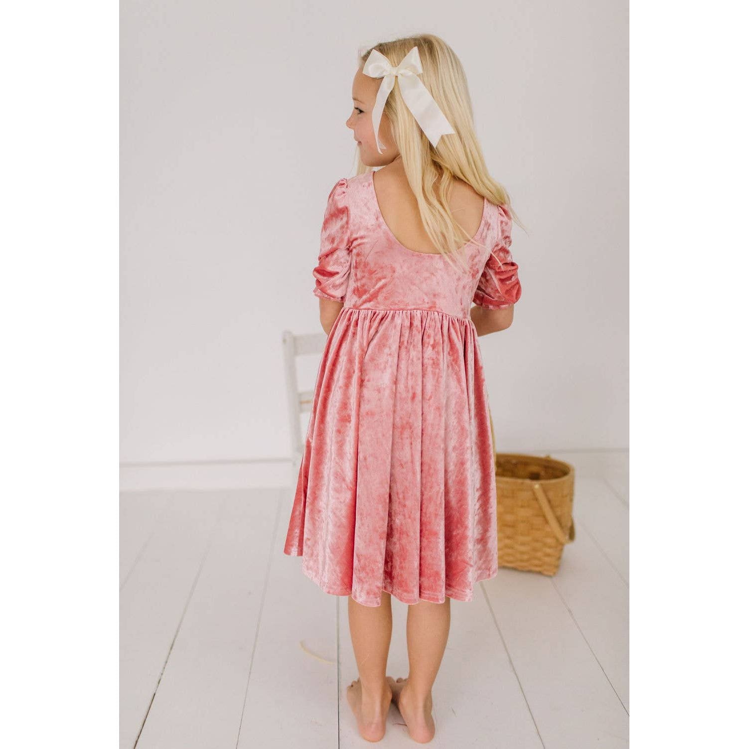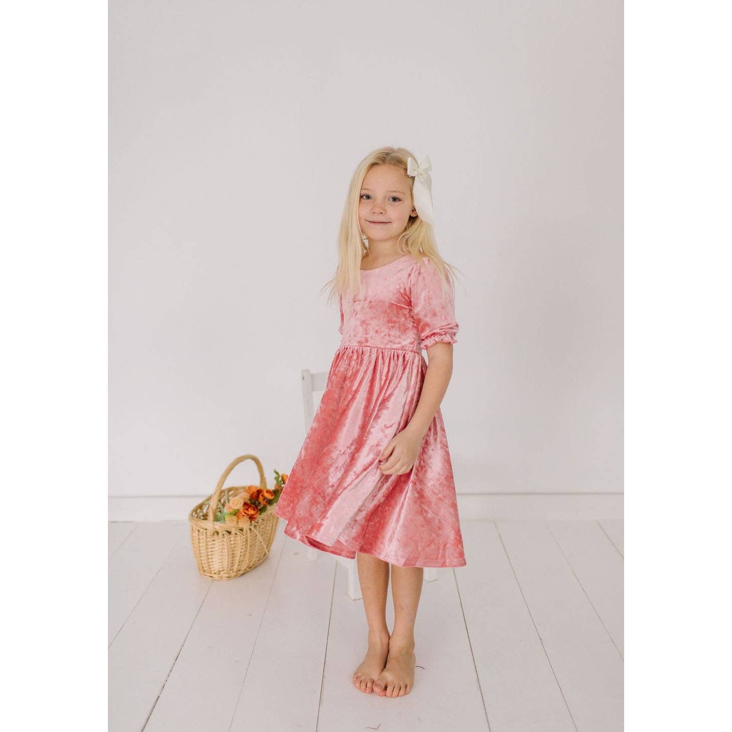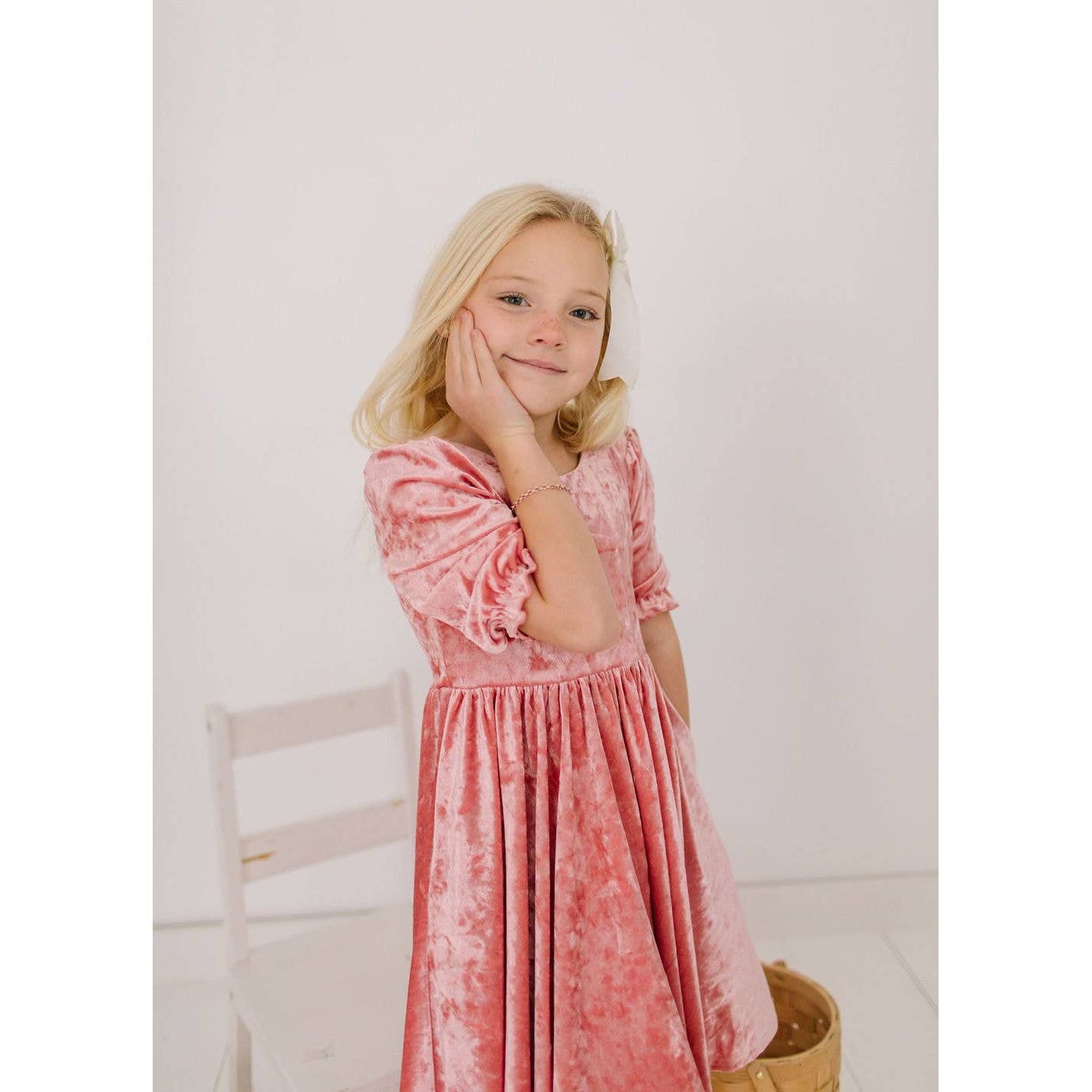 The Pippa Dress combines cozy comfort with charming style. Made from soft velvet fabric, it features 3/4 sleeves with elastic ruffle cuffs, a full circle skirt with handy pockets, and a flattering scoop back—perfect for twirling and everyday wear alike.