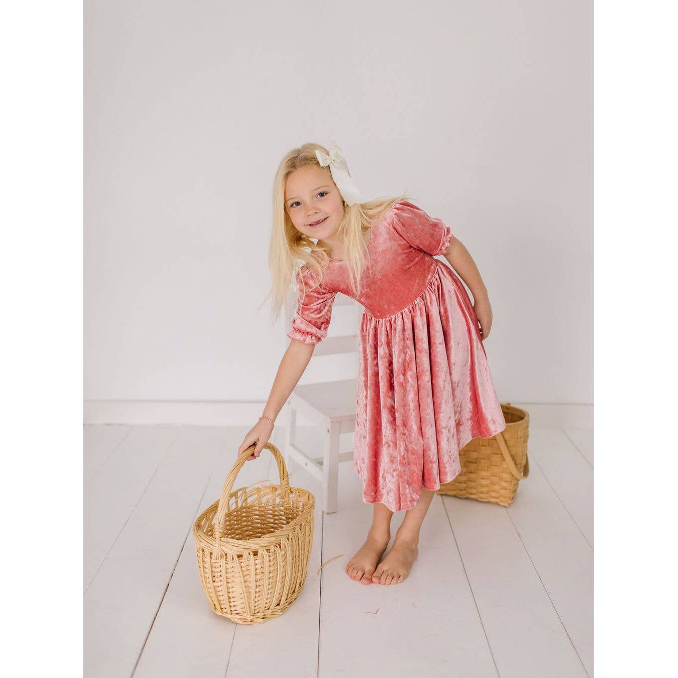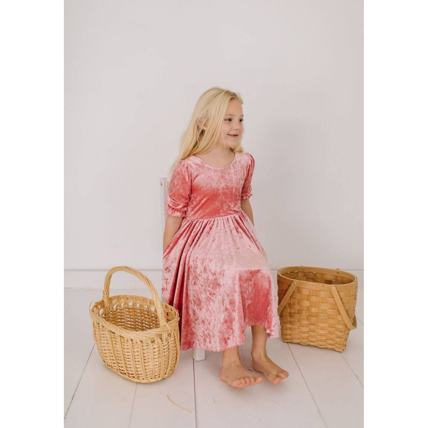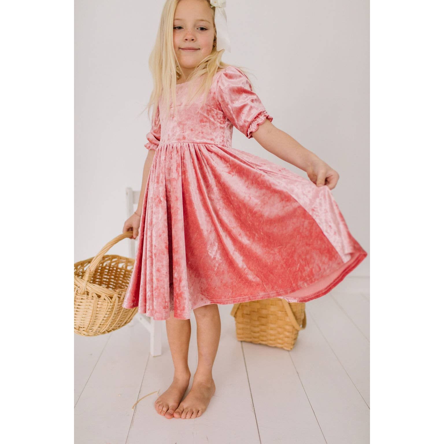 The Pippa Dress combines cozy comfort with charming style. Made from soft velvet fabric, it features 3/4 sleeves with elastic ruffle cuffs, a full circle skirt with handy pockets, and a flattering scoop back—perfect for twirling and everyday wear alike.