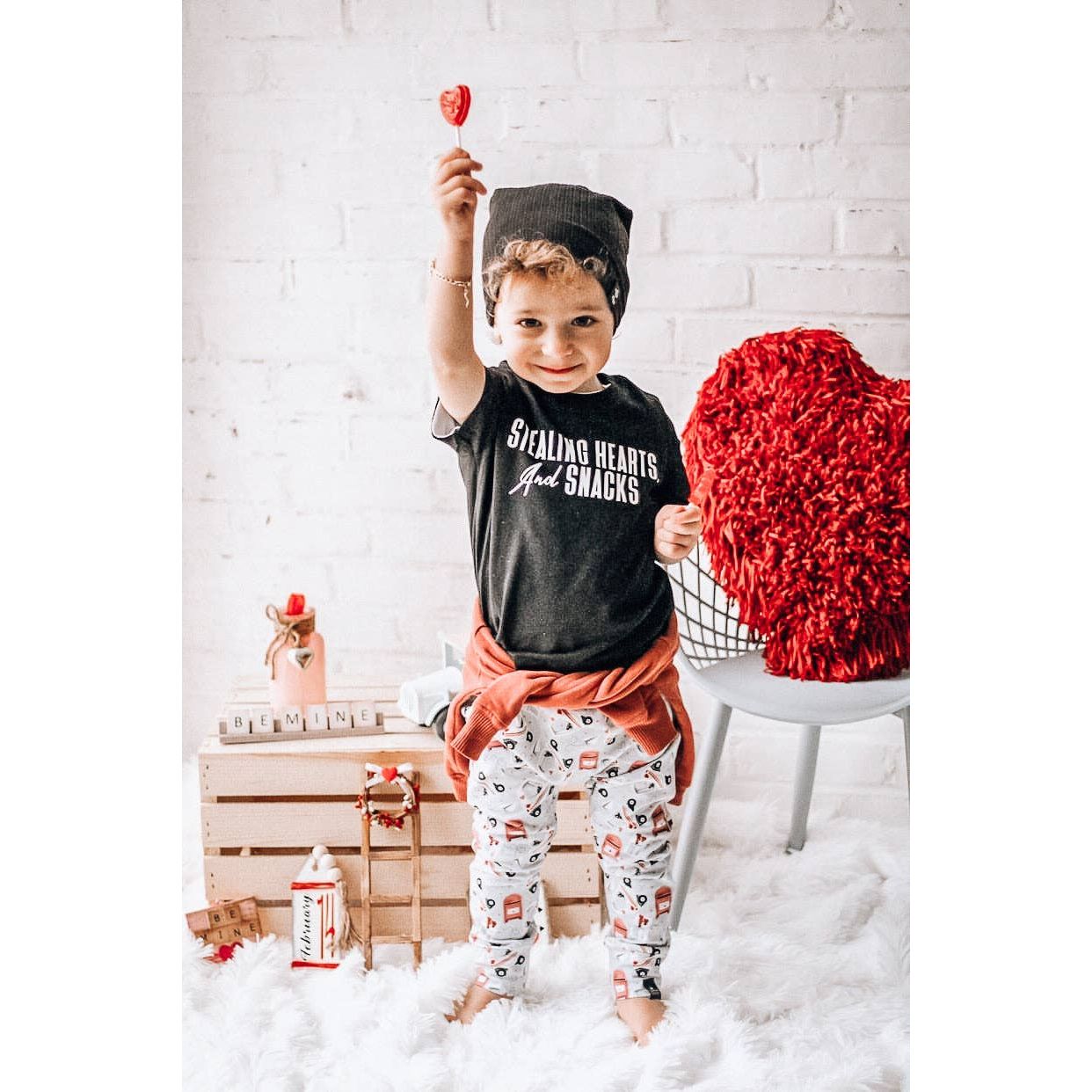 "Stealing Hearts & Snacks" Boy's T-Shirt For mama's little heart breaker and snack taker! Shirt Colors: White, Black, Natural, Red Sizes: 6M, 12M, 18M, 2T, 3T, 4T, 5/6 Cotton Blend