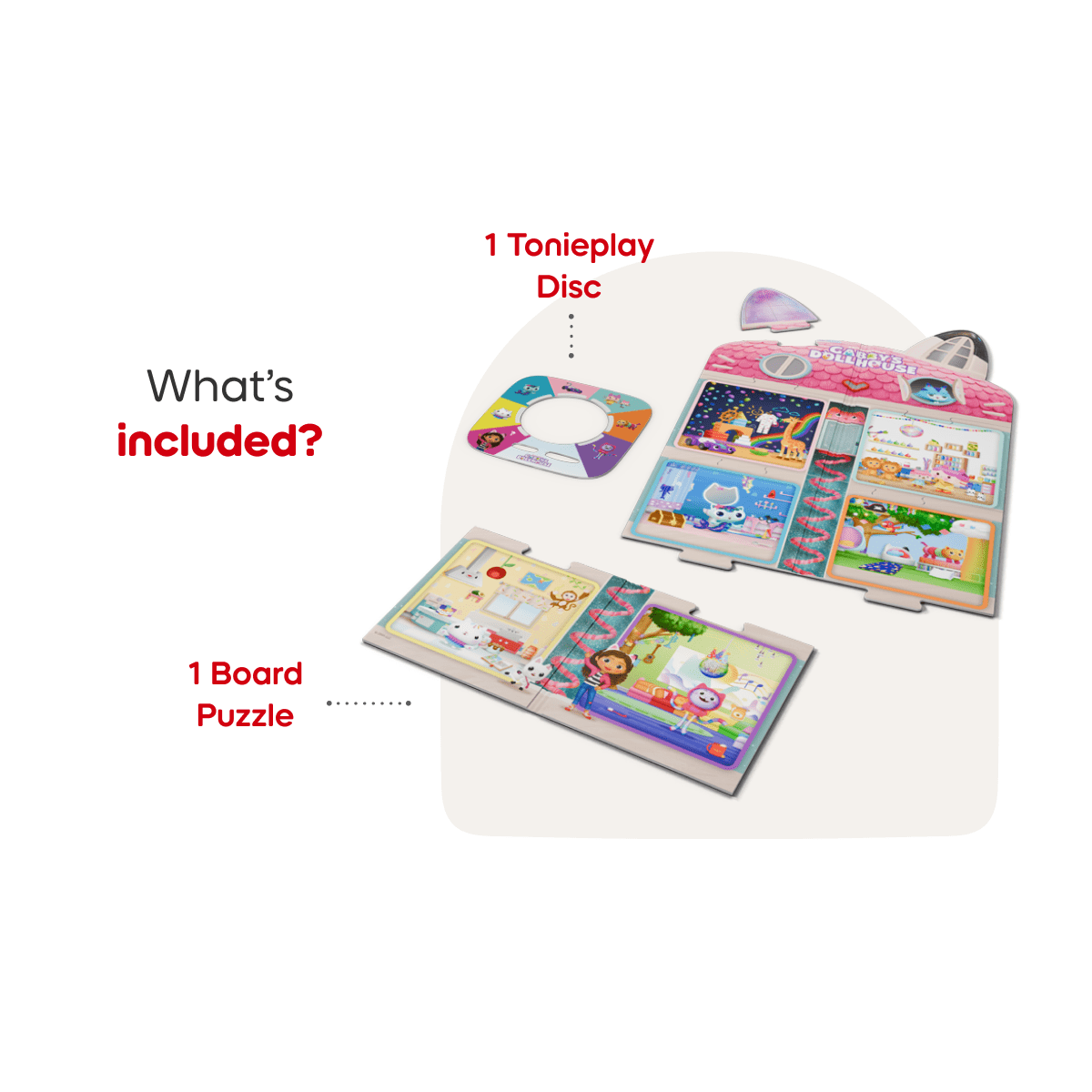 In this Tonieplay Game, kids step into Gabby’s Dollhouse filled with magical adventures! Made for ages 3+, kids can use the included puzzle map of Gabby’s Dollhouse to uncover hidden objects, enjoy songs from the show, and help CatRat on his sandwich quest for hours of fun and adventure.