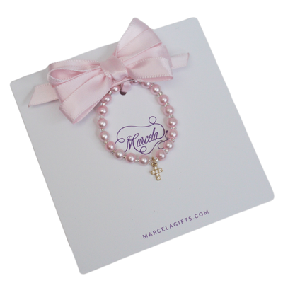Pink Satin Bow and Pearl Bracelet Set with Jeweled Cross