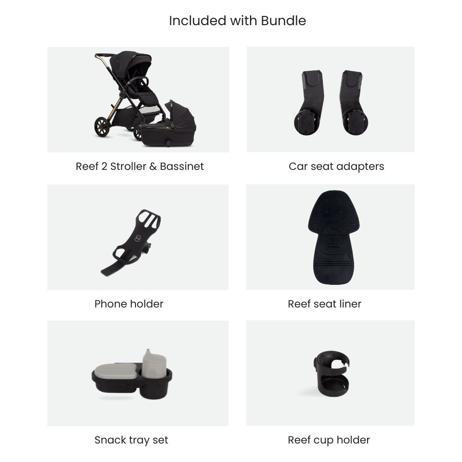 Be ready for every adventure with baby with this exclusive Silver Cross bundle that includes the NEW Silver Cross Reef 2 Stroller in Espresso, Car Seat Adapters, Cup Holder, Phone Holder, Seat Liner, Snack Tray and Rain Cover.