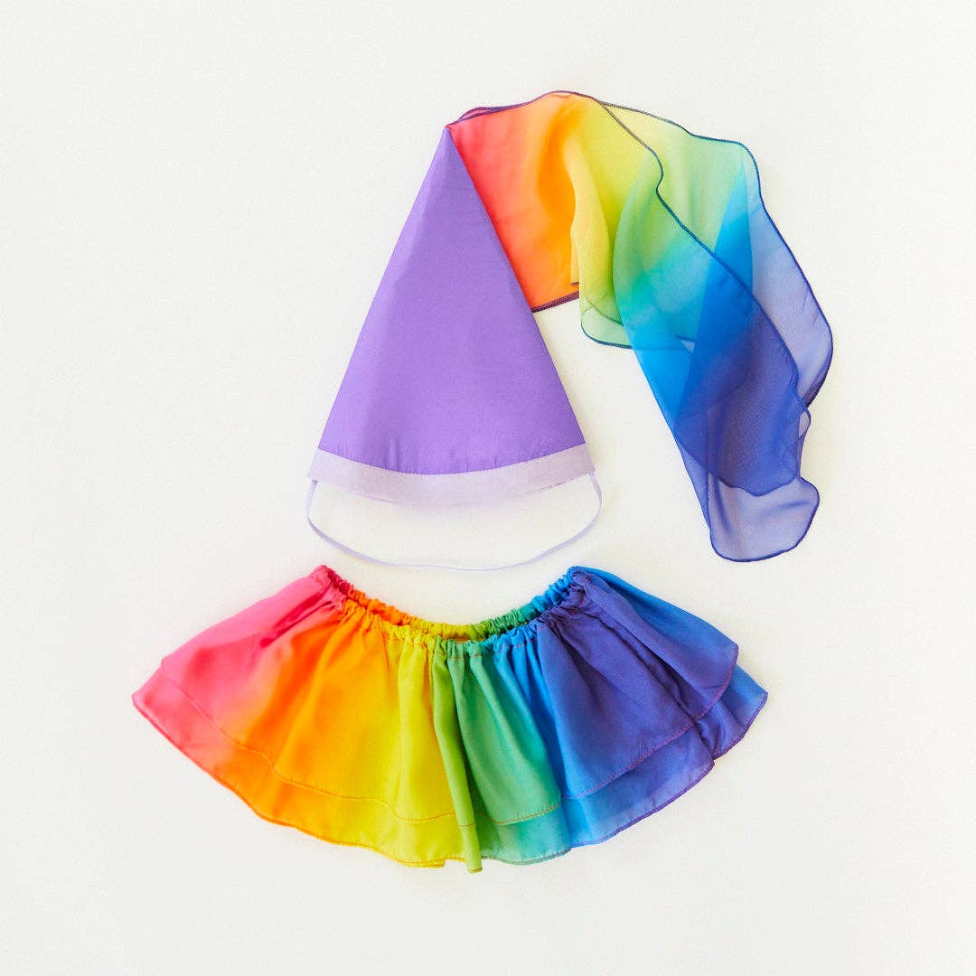 The Purple & Rainbow Hat is made of 100% pure mulberry silk, perfect for make believe as a jester, ballerina, magician, and so much more! In our best-selling deep purple colorway with a flowing georgette rainbow tassel, this sustainably made dress-up piece brings magic to every dress-up box.