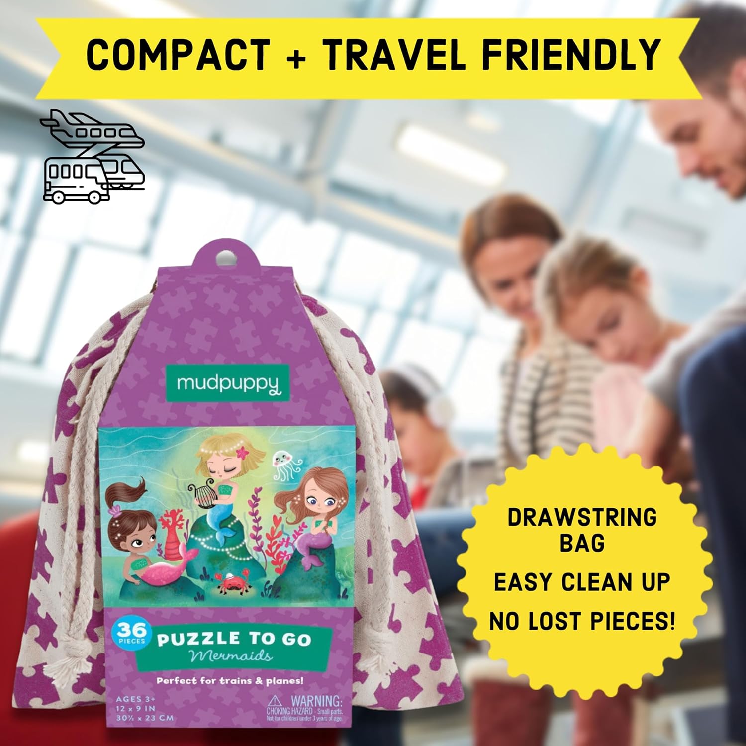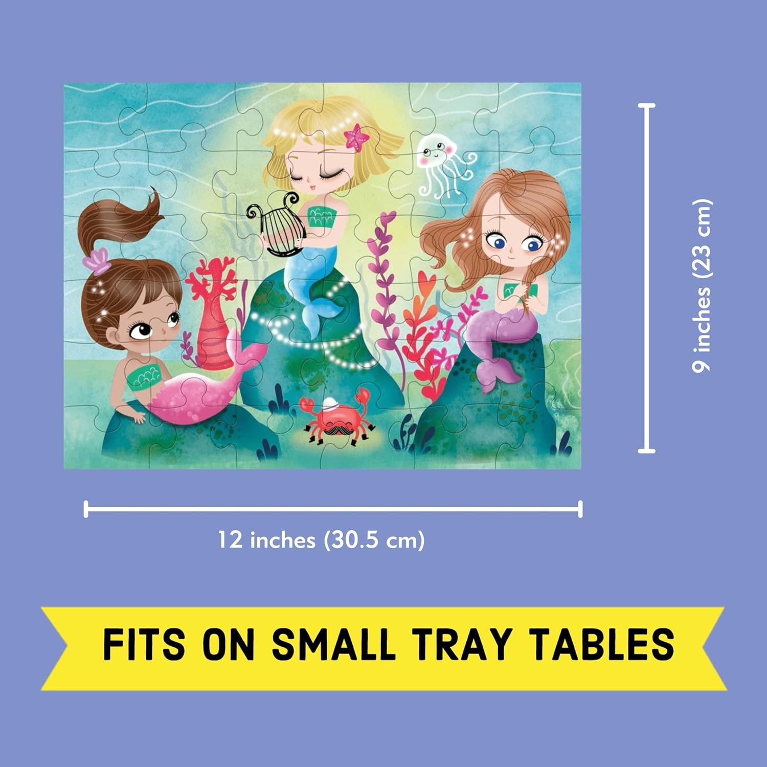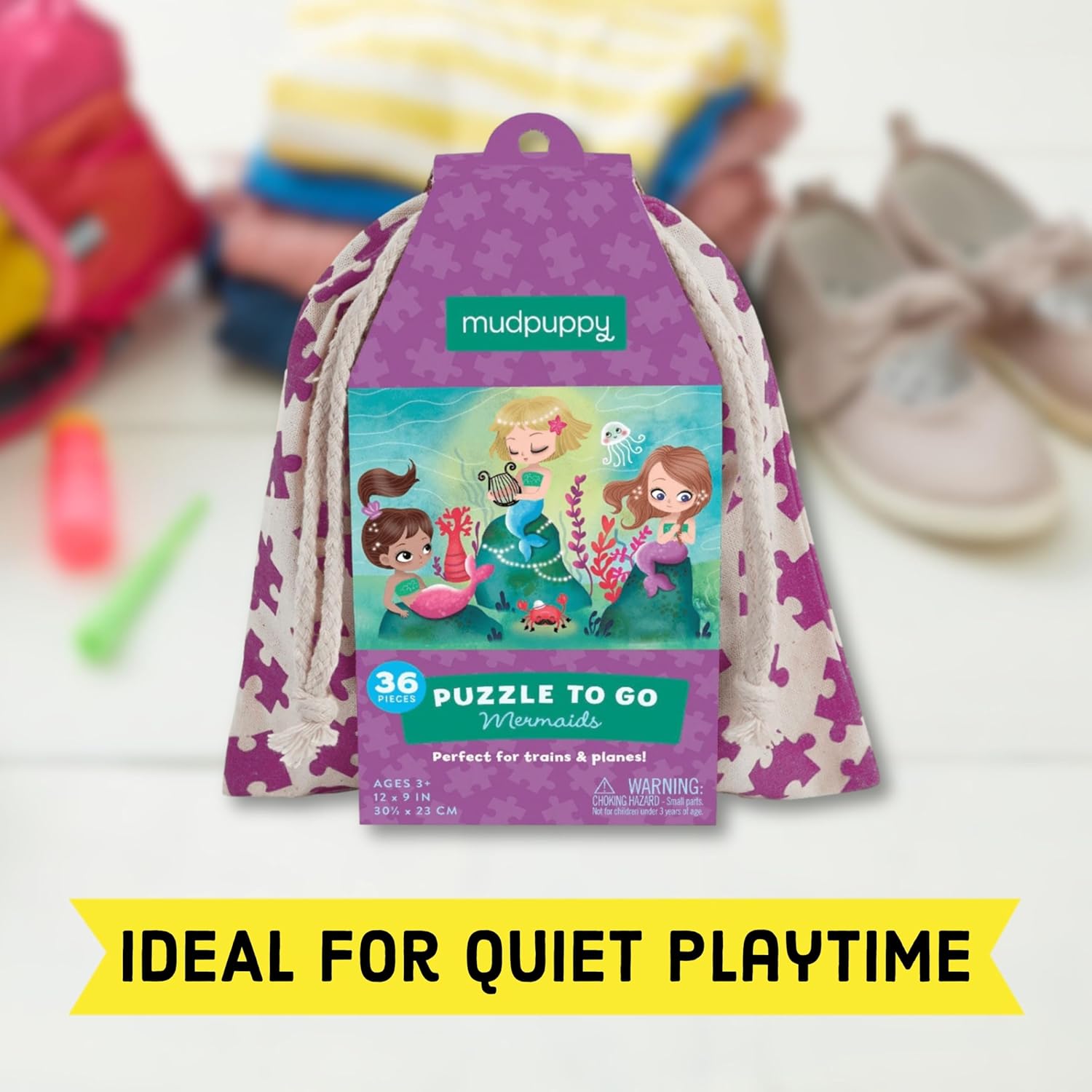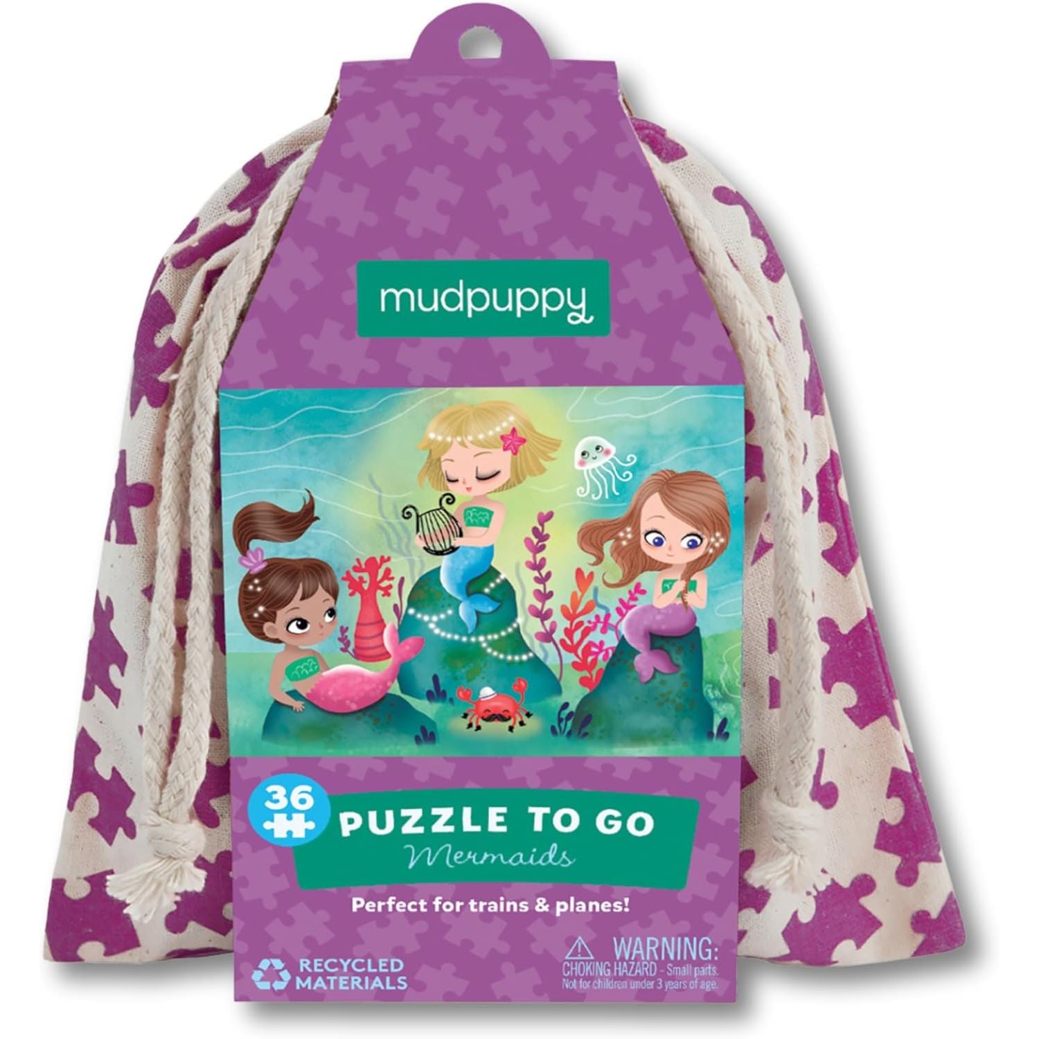 36 Piece Puzzle – Dive into a magical underwater world with the Mermaid 36 Piece Puzzle To Go! Perfect for kids ages 3 and up, this puzzle features a vibrant scene of mermaids swimming among seashells, sparkling treasures, and friendly ocean creatures. Packaged in a 100% cotton drawstring bag, it’s easy to take on the go or enjoy at home. A postcard with the completed puzzle image is included for reference. Once assembled, the puzzle measures 12” x 9,” making it perfect for small spaces.