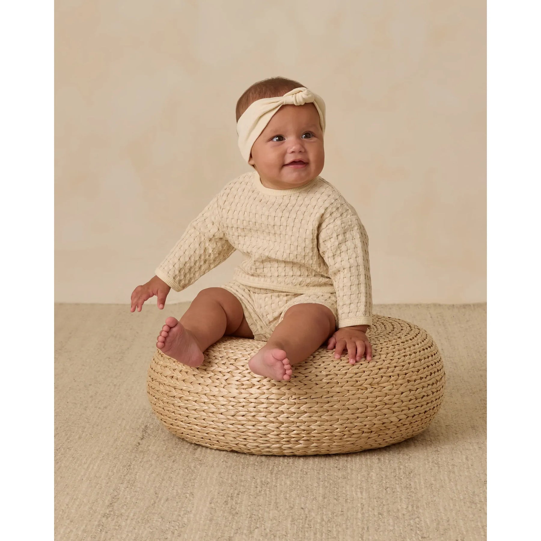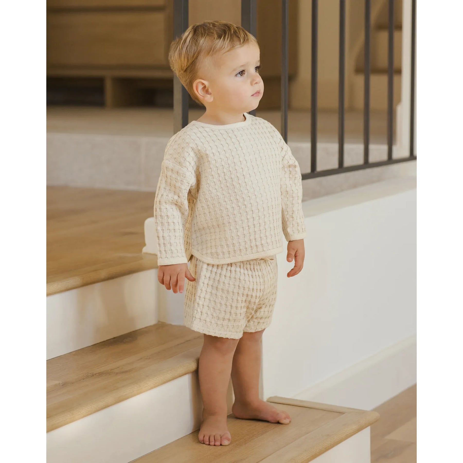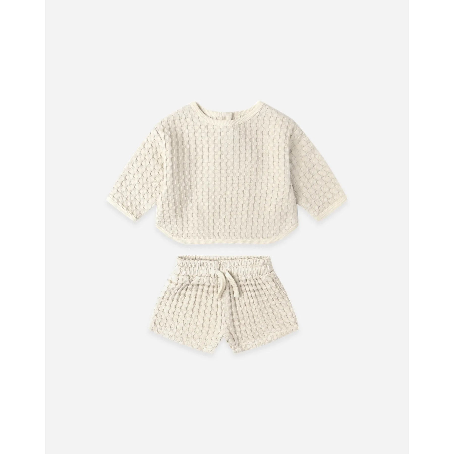 Our Flynn Set is made from our chunky waffle knit and features a boxy long sleeve top with coconut buttons at the back neck, plus matching pull-on shorts for all-day comfort.