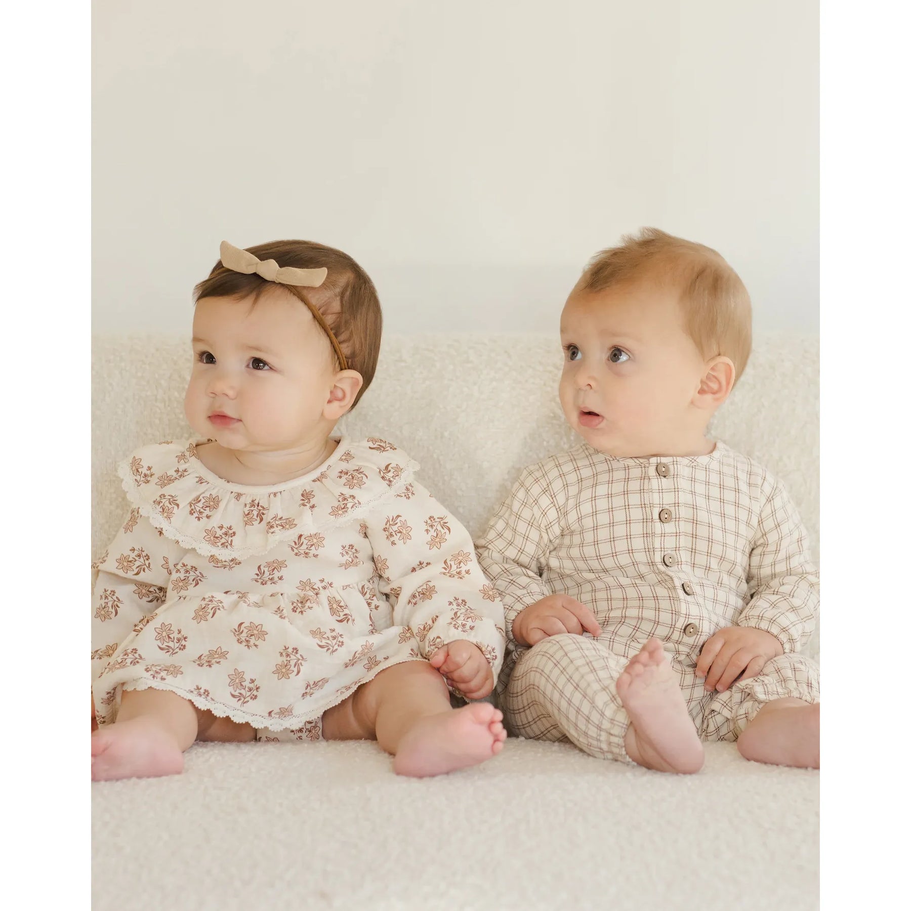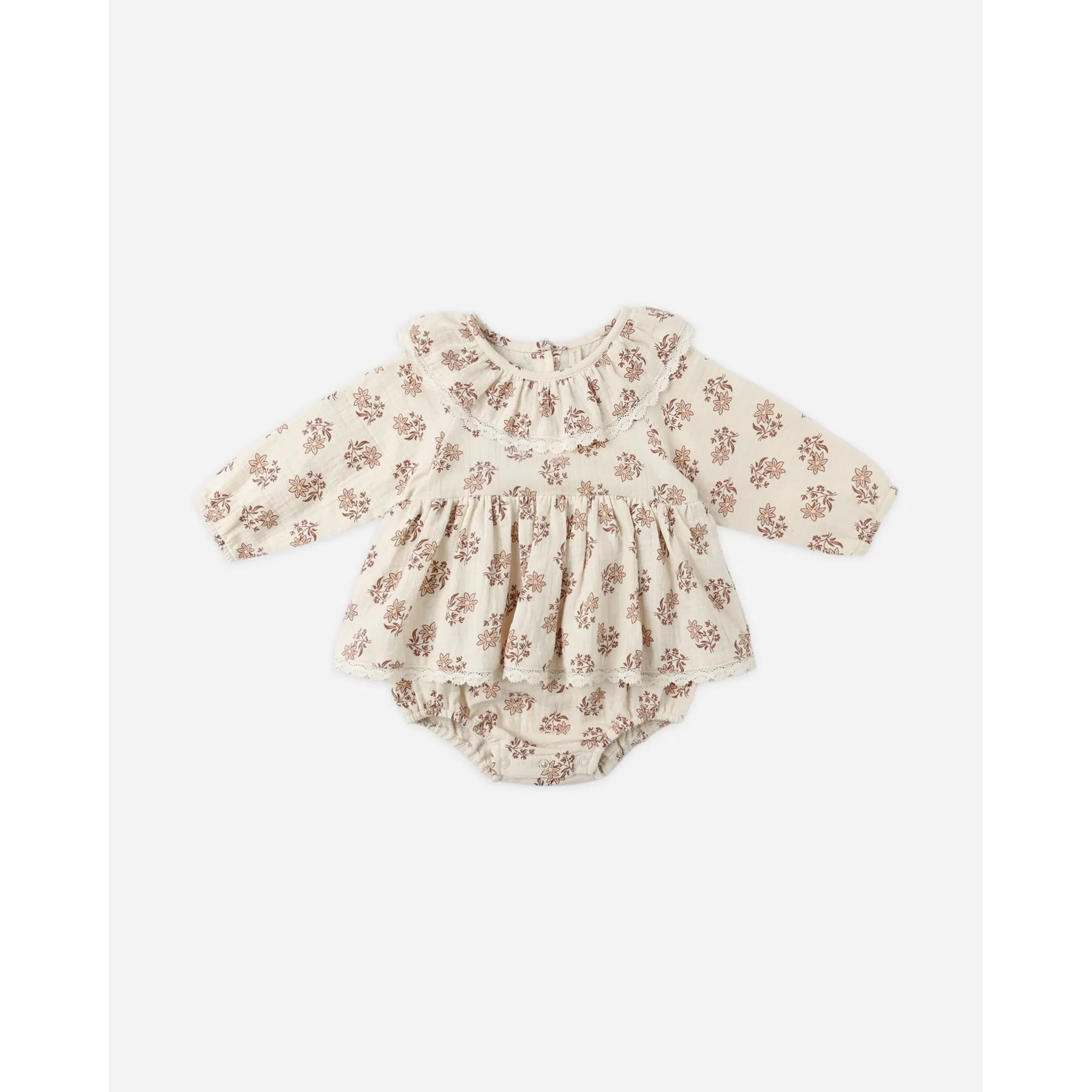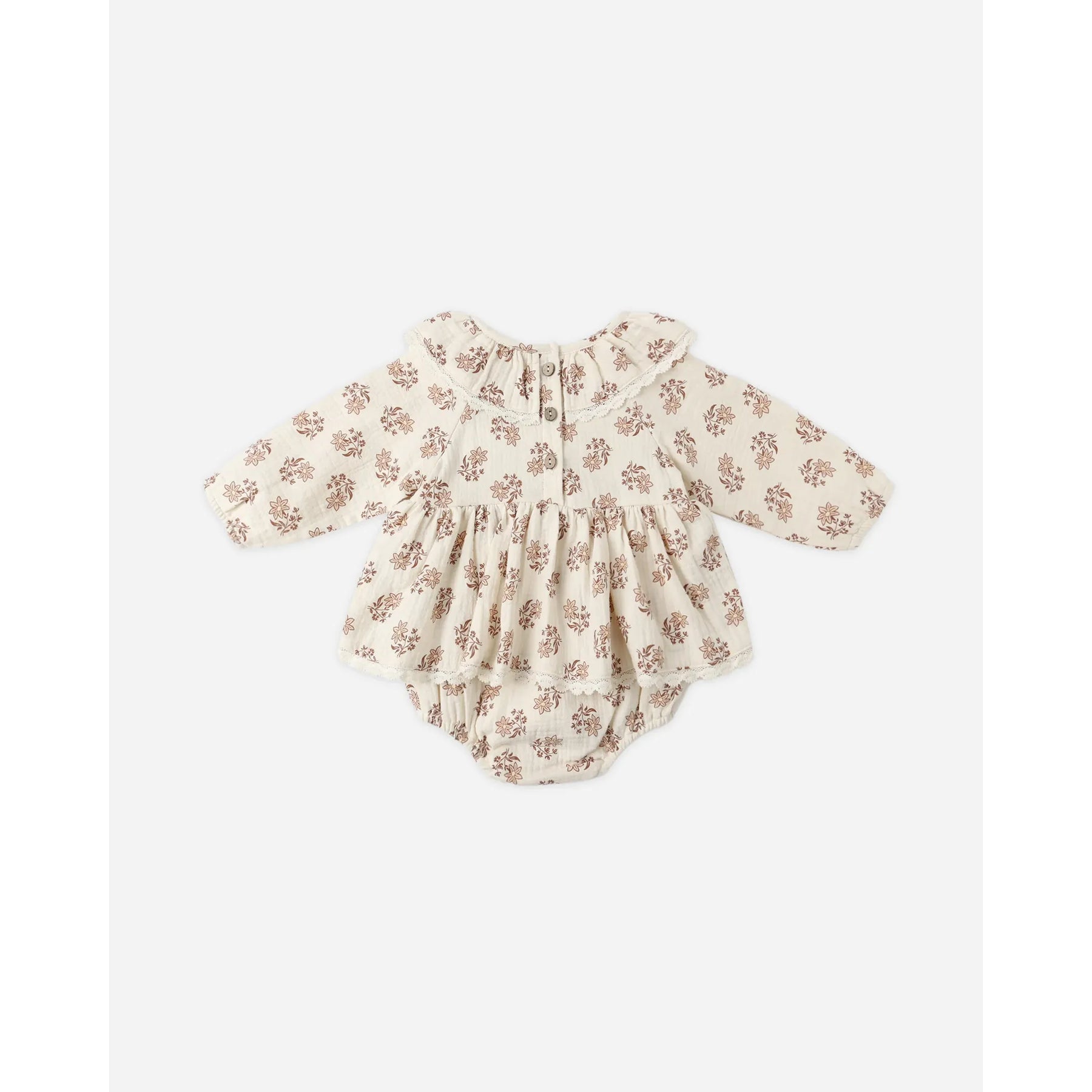 Our Thalia Romper features a sweet collar, delicate lace trim, a gathered waist, coconut buttons down the back, and bottom snaps for easy changes.