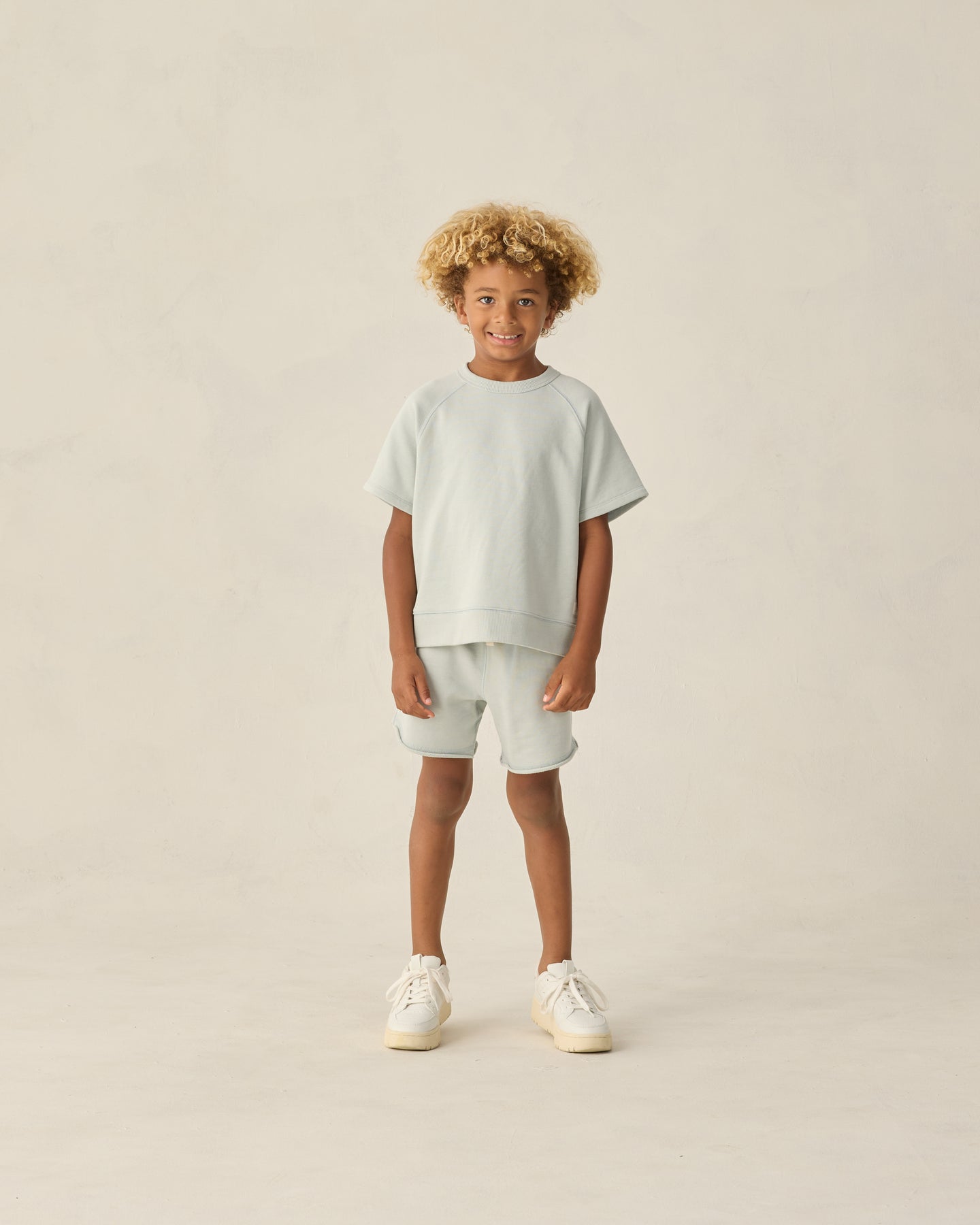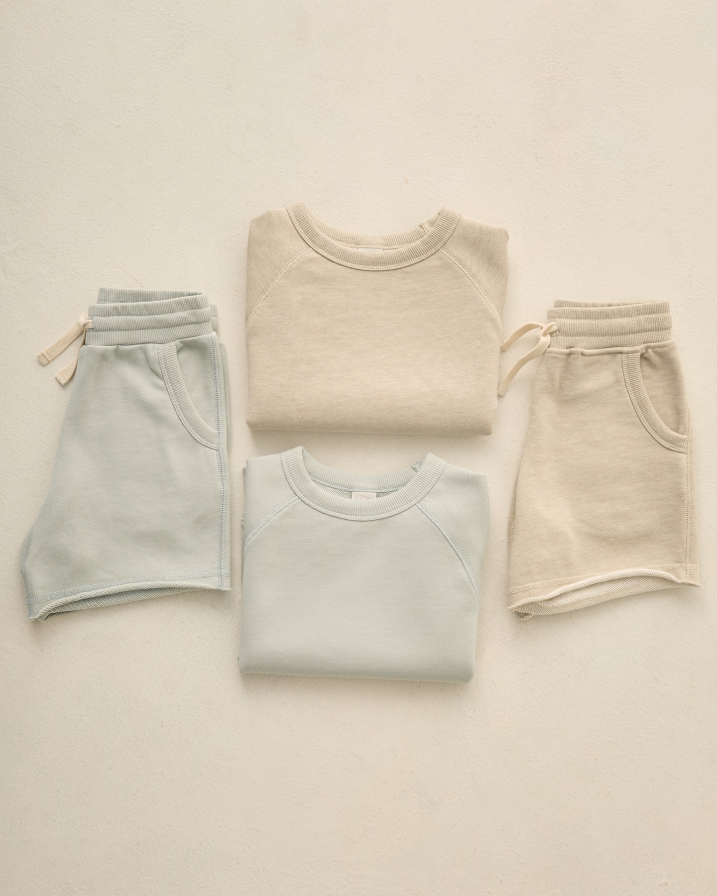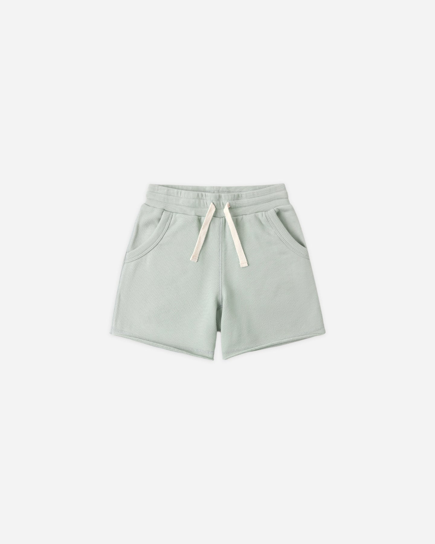 An everyday short featuring a classic elastic waistband, durable drawstrings, side pockets, and a raw edge.