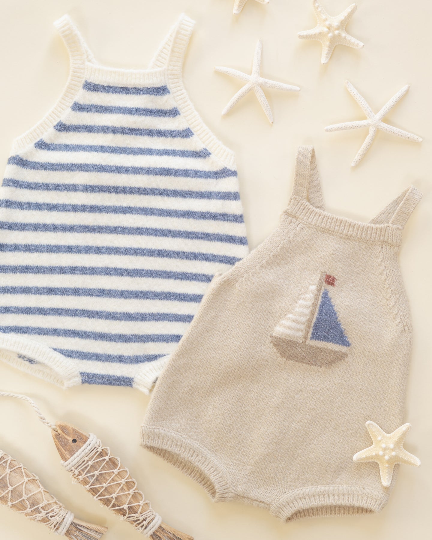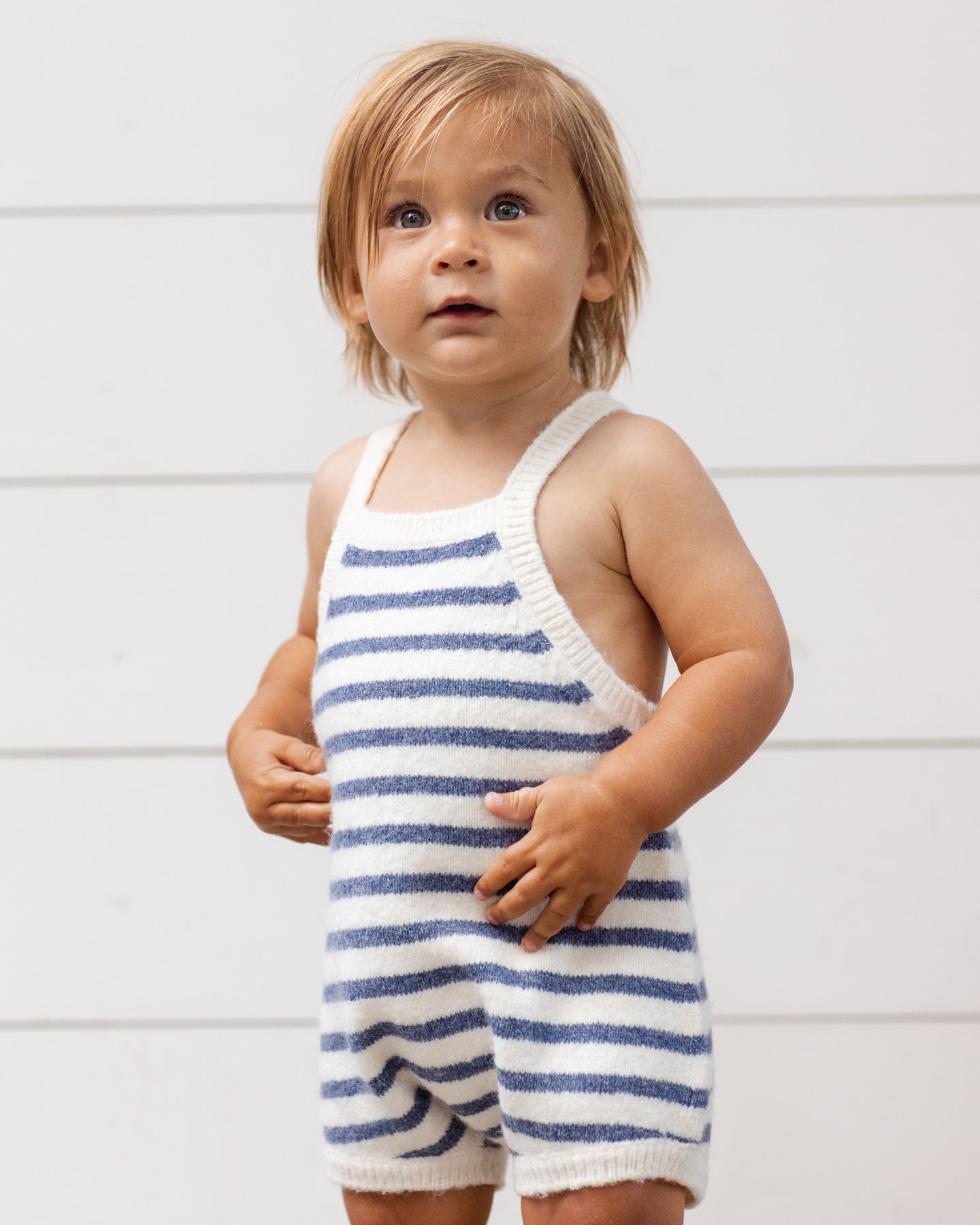 Perfect for warmer weather, our Fisher Romper is a simple and easy look for your little ones. Designed with ribbed criss cross straps and coconut buttons.