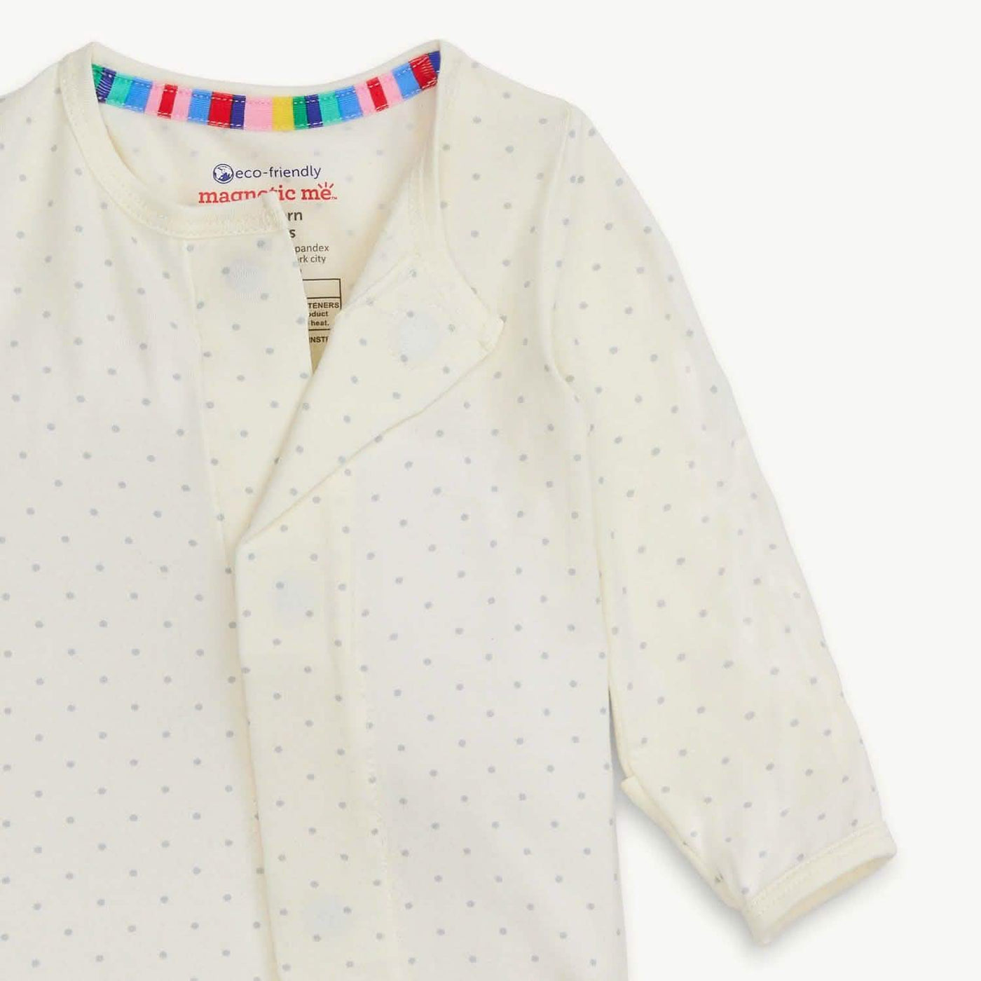 - Magnetic closures: magnets line the seam from the neck to upper thigh for sizes up to 0-3m & from neck to crotch for sizes 3-6m and up.