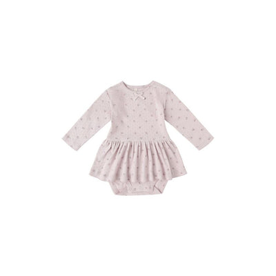 Quincy Mae Pointelle Skirted Bodysuit, Lilac Ditsy. A sweet everyday style, our Pointelle Skirted Bodysuit pairs a peplum skirt with long sleeves and a bow at the neck. Designed with snaps at the shoulder and bottom for easy changes.