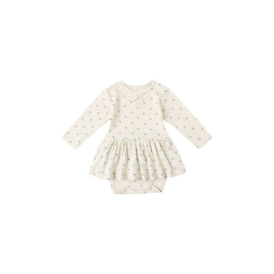 Quincy Mae Pointelle Skirted Bodysuit, Blue Ditsy. A sweet everyday style, our Pointelle Skirted Bodysuit pairs a peplum skirt with long sleeves and a bow at the neck. Designed with snaps at the shoulder and bottom for easy changes.