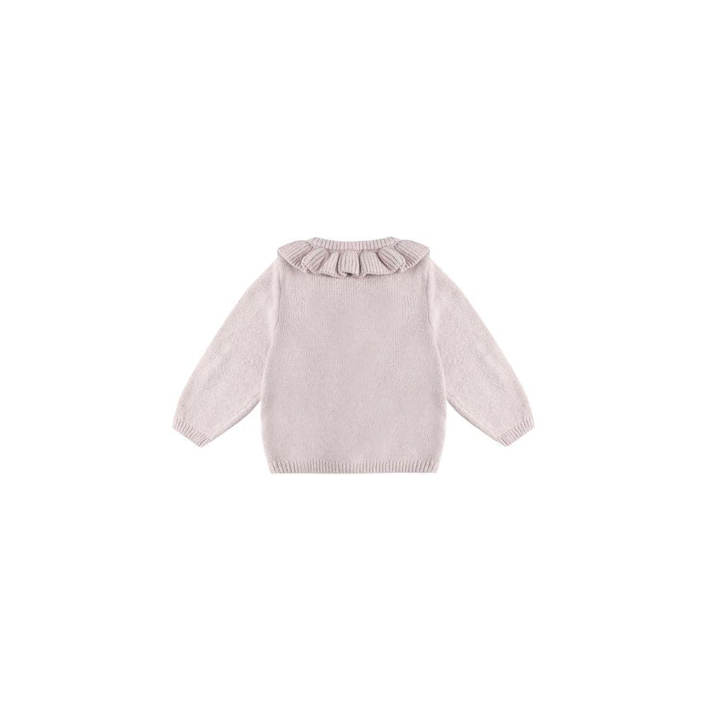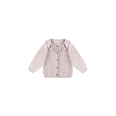 Quincy Mae Ruffle Collar Cardigan, Lilac. This sweet cardigan features a charming ruffle collar and coconut buttons, making it perfect for layering on fall and winter days.