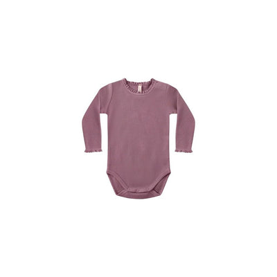 Quincy Mae Waffle Long Sleeve Bodysuit, Mulberry. Long sleeve onesie in our lightweight waffle knit, featuring the sweetest crochet lace ruffle detail. Designed with shoulder and bottom snaps for easy changes.