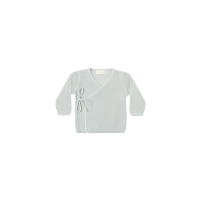 Quincy Mae Knit Wrap Top, Ice Blue. This Knit Wrap Top features an inside snap and outside tie for easy dressing, creating a cozy and darling look. Pair with our Footed Knit Pants for a complete outfit.